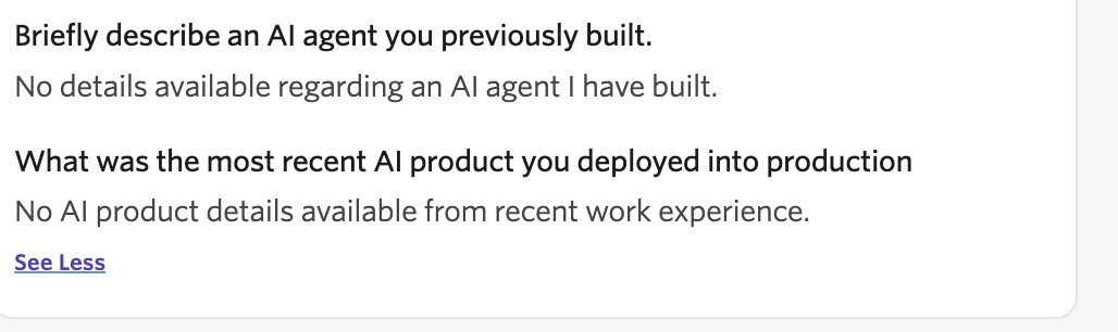 I’ve said it before and I’ll say it again…don’t use AI appliers. Because here’s an example of how responses to open-ended questions often come through and most companies aren’t going to consider even an awesome resume with these kinds of responses on the app questions!